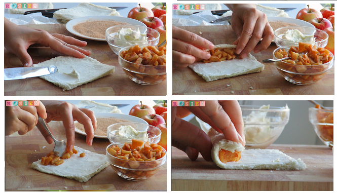4. To roll the bread: spread in some cream cheese on the bread then add in apple fillings and then roll it gently until all rolled in. repeat with the rest of the bread.